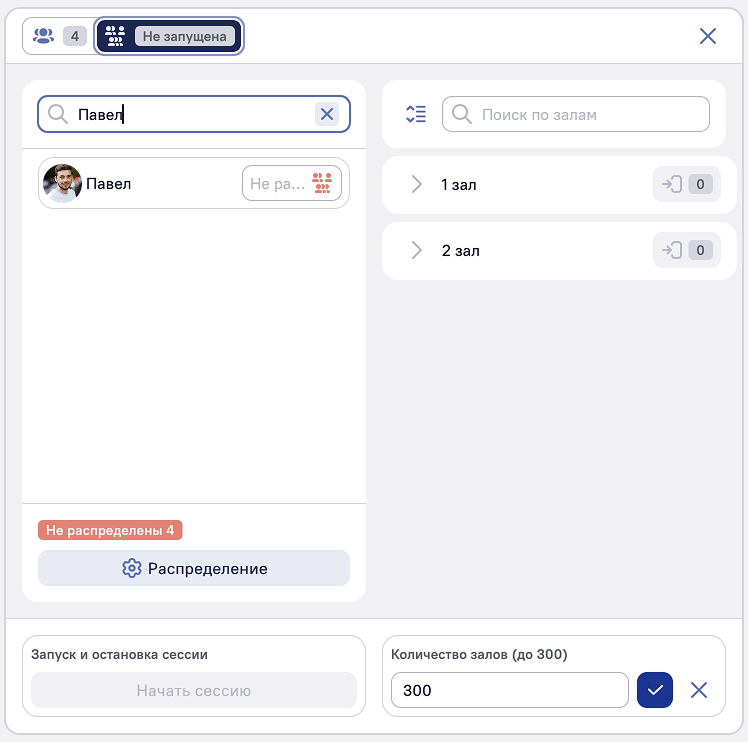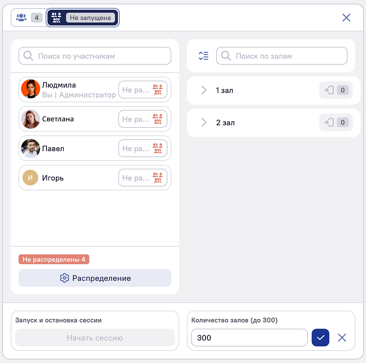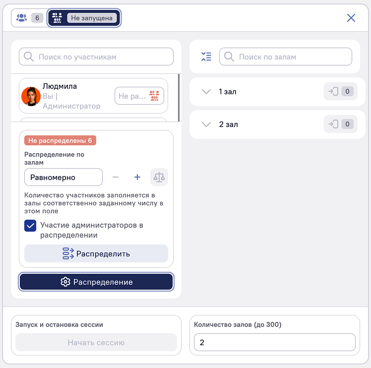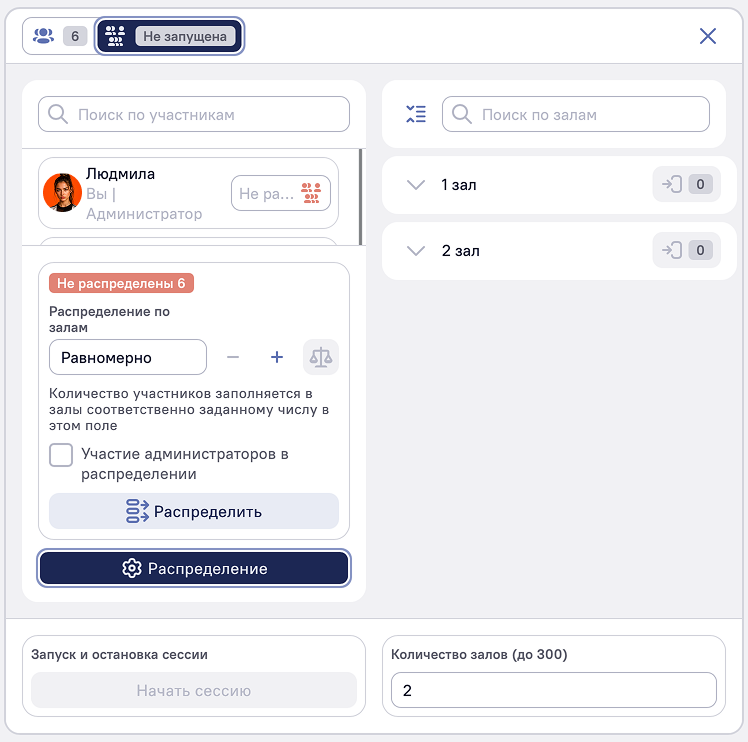 Система делит участников так, чтобы группы получались максимально одинаковыми по численности. Подходит для обсуждений, мозговых штурмов и любой групповой работы, где важен баланс. Для этого в поле «Распределение по залам» достаточно оставить вариант «Равномерно».