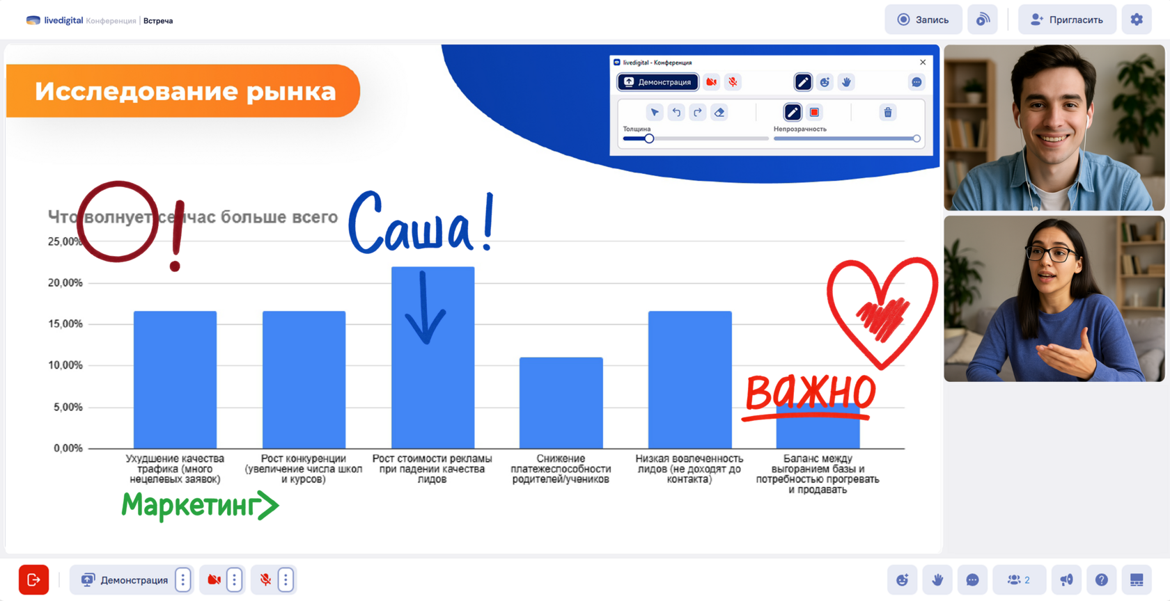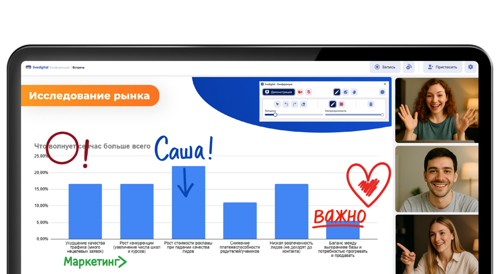 Для преподавателей это отличный способ превратить урок в интерактивный диалог, где студенты не просто слушают, а активно участвуют. Для команд — возможность по-настоящему брейнштормить: обсуждать интерфейсы, выделять важные моменты в презентации, быстро вносить правки и предлагать идеи.