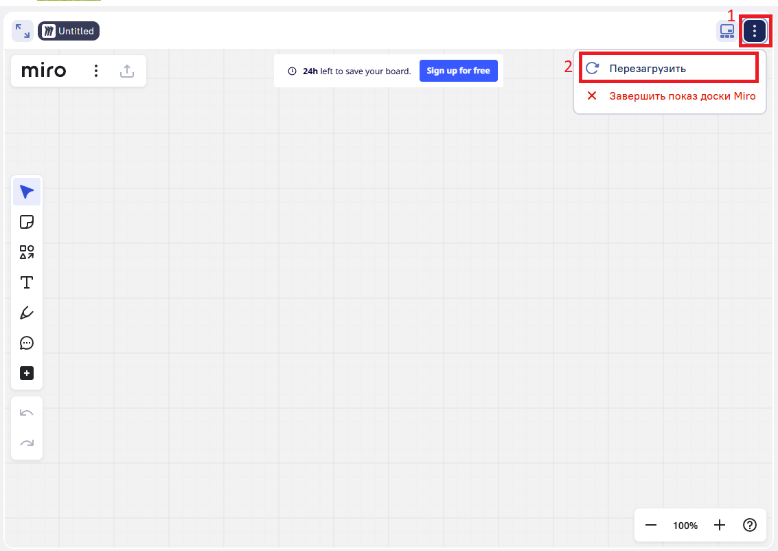 — Устранили ошибку, которая приводила к бесконечной загрузке доски Miro, а также добавили в меню слота доски/трансляции пункт “Перезагрузить”, чтобы можно было повторно загрузить доску без выхода из комнаты